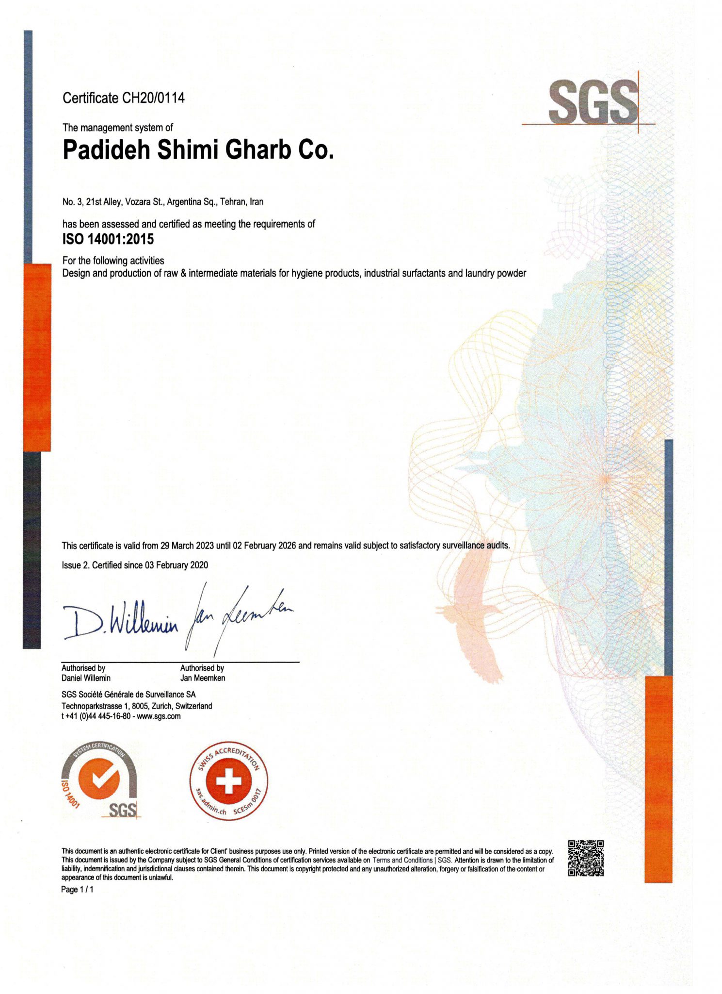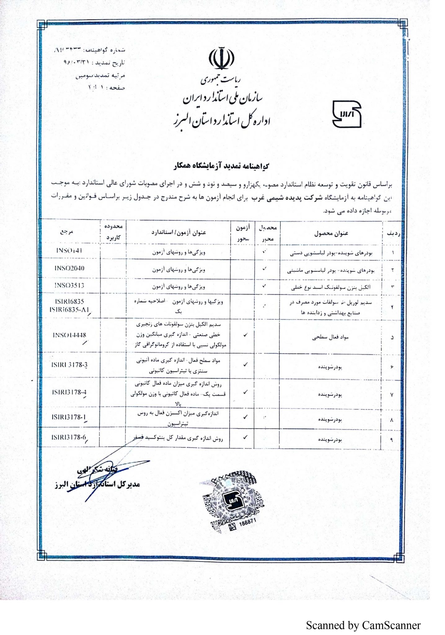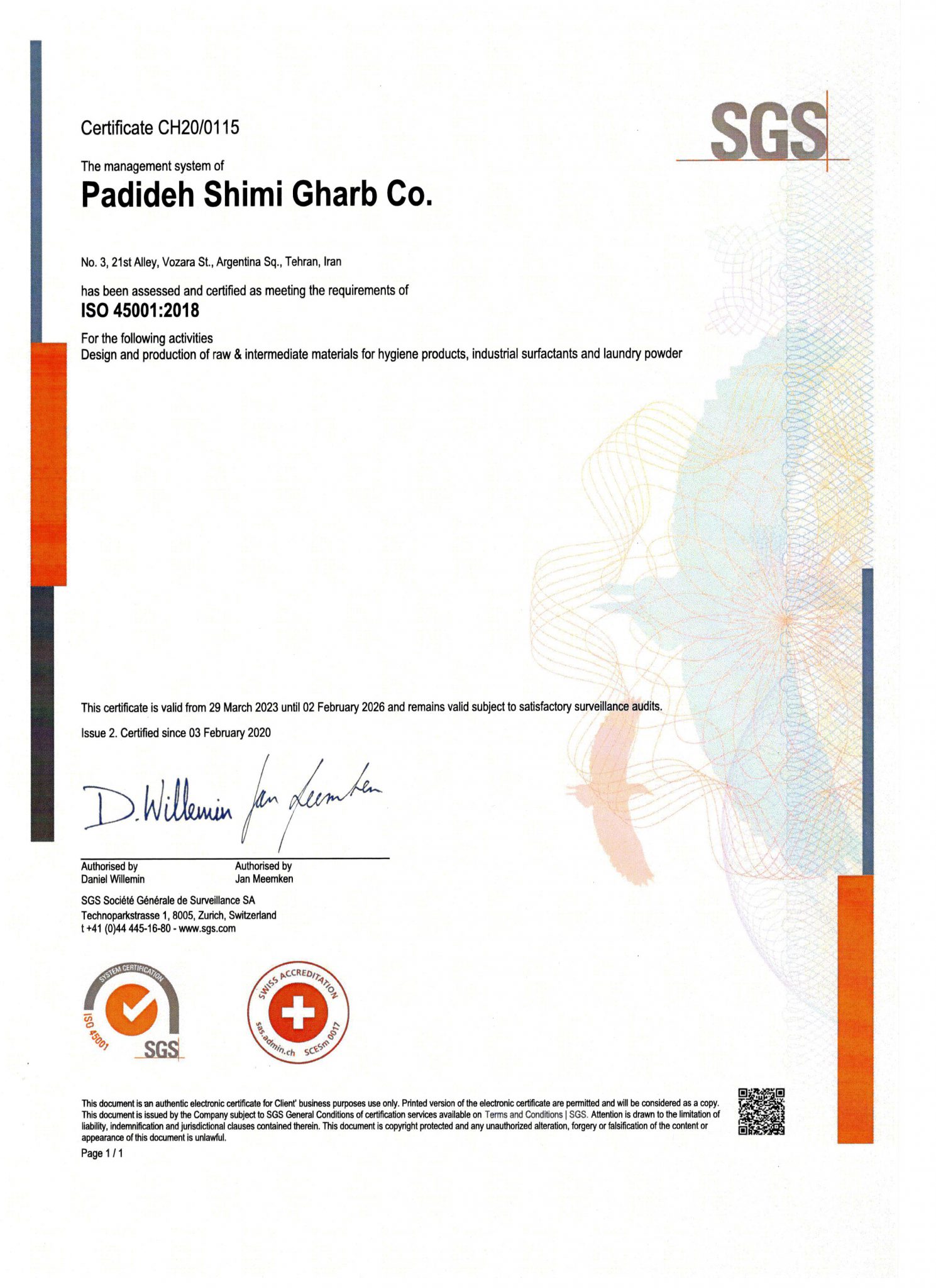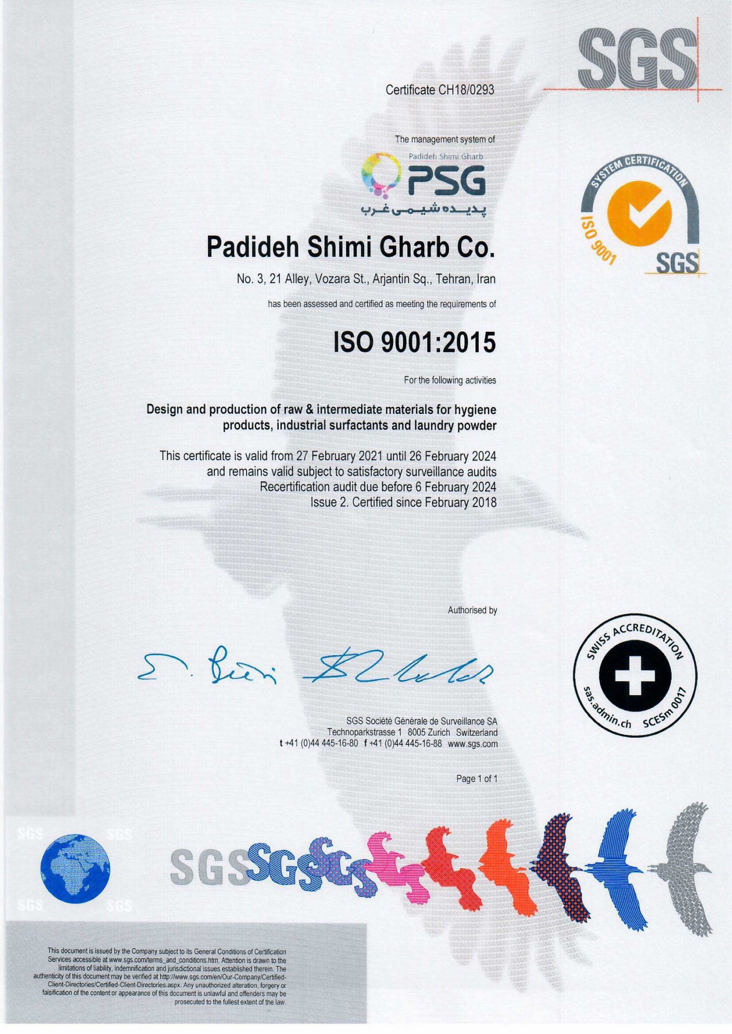 Padideh Shimi Gharb Company is proud to announce that during its years of activity in the field of producing raw materials and final cleaning products, it has endeavored to become one of the pioneers in this industry by utilizing the latest production knowledge. Achieving reputable certifications in this field for producing high-quality products has been a top priority for us.